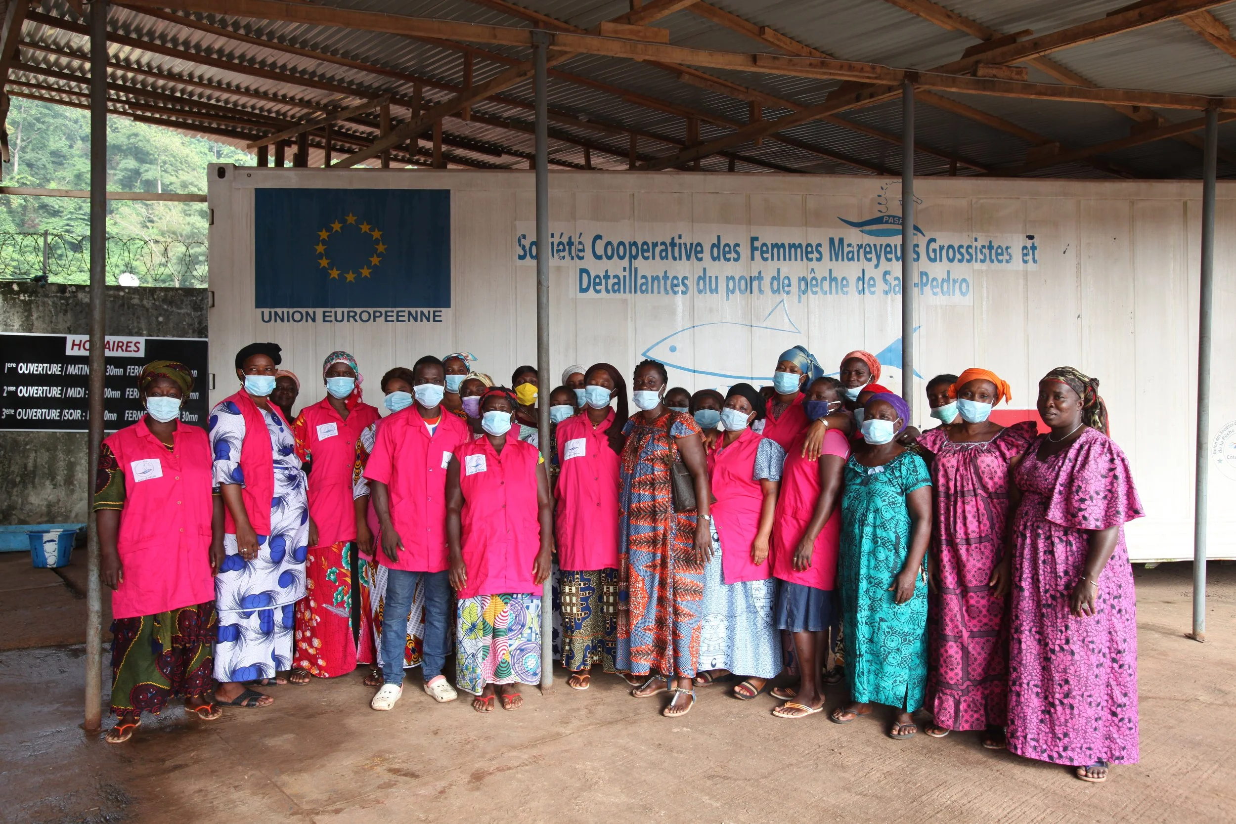 Au niveau national, la mise en œuvre de l’accord de l’OMC sur les subventions de la pêche pourrait servir à développer les initiatives vers une pêche durable, notamment les infrastructures de la chaîne du froid. Photo : au port de San Pedro (Côte d’Ivoire), les femmes de l'Union des Sociétés Coopératives des Mareyeuses et Transformatrices des Produits de la Pêche pose devant un conteneur frigorifique grâce auquel les pertes post-captures ont fortement diminué.