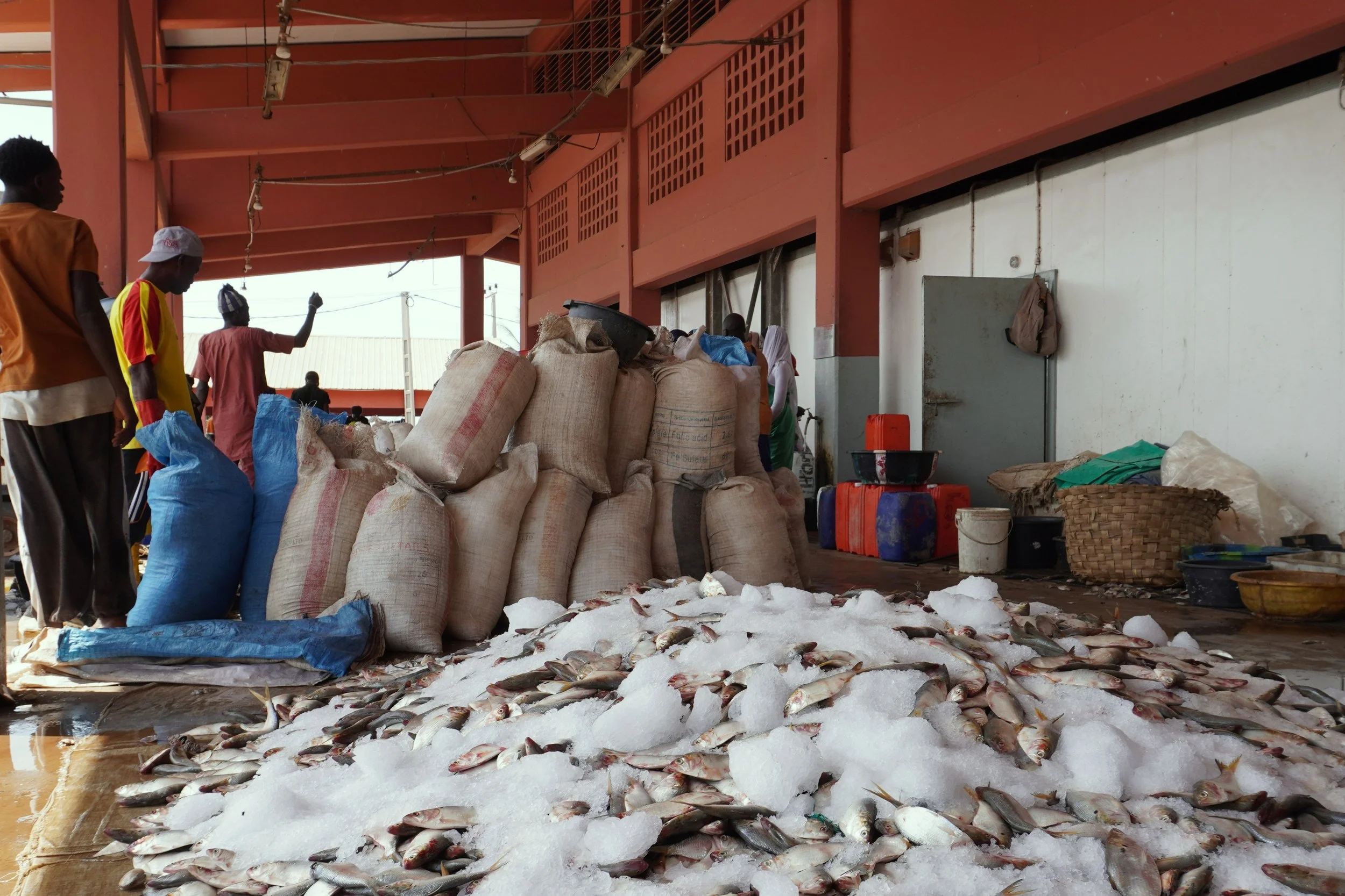 Les aides publiques doivent renforcer les économies, les chaînes de valeur et les communautés locales afin de garantir que les océans subviennent aux besoins des populations, plutôt que de favoriser des pratiques qui épuisent les ressources et aggravent les inégalités. Photo : Sur le site de débarquement de Gunjur, en Gambie, des travailleurs chargent des sacs de glace et de poisson dans des camionnettes pour les acheminer vers les marchés situés à l'intérieur des terres, par Margaux Rochefort.