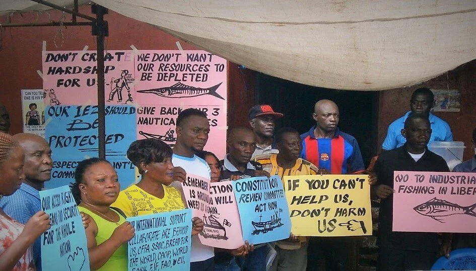 A protest by LAFA (Liberian artisanal fisheries association) against their Government’s “trawler-friendly move” in 2017. Photo: CFFA Archive.
